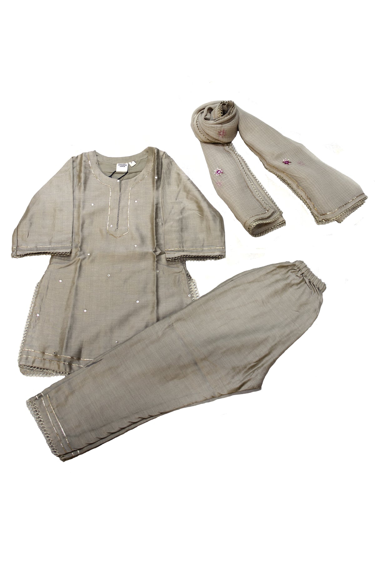 Chanderi Silk Mirror Work and Gota Lace Girls Kurta Set in Safari
