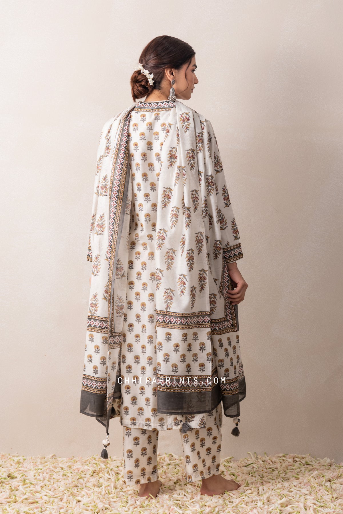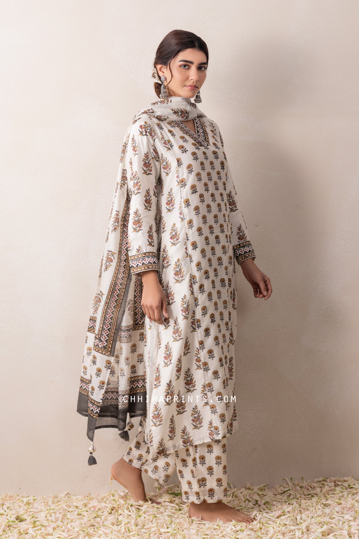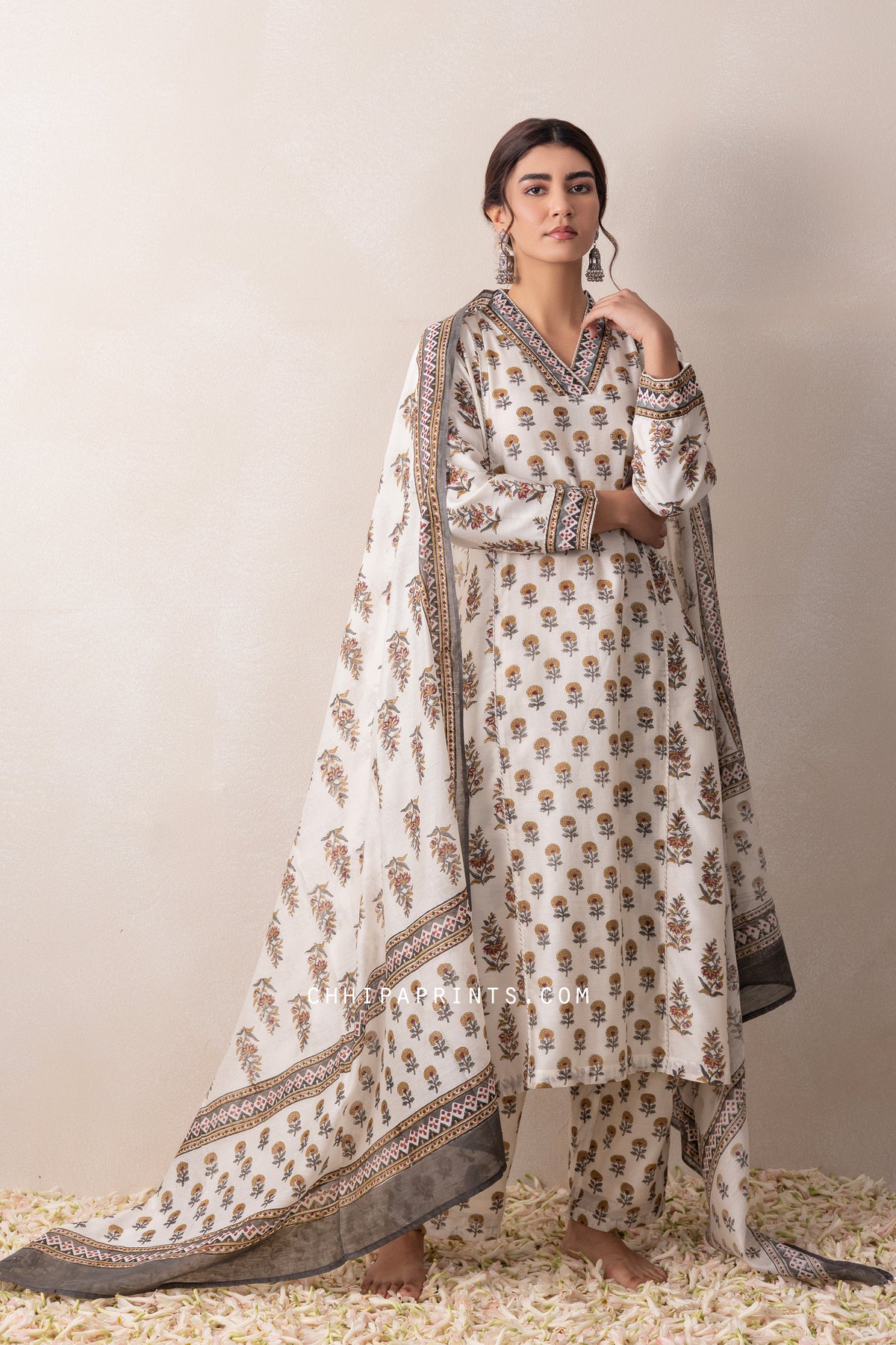 Chanderi SIlk Block Print Buti Buta Kurta Set in Shades of Ivory & Grey