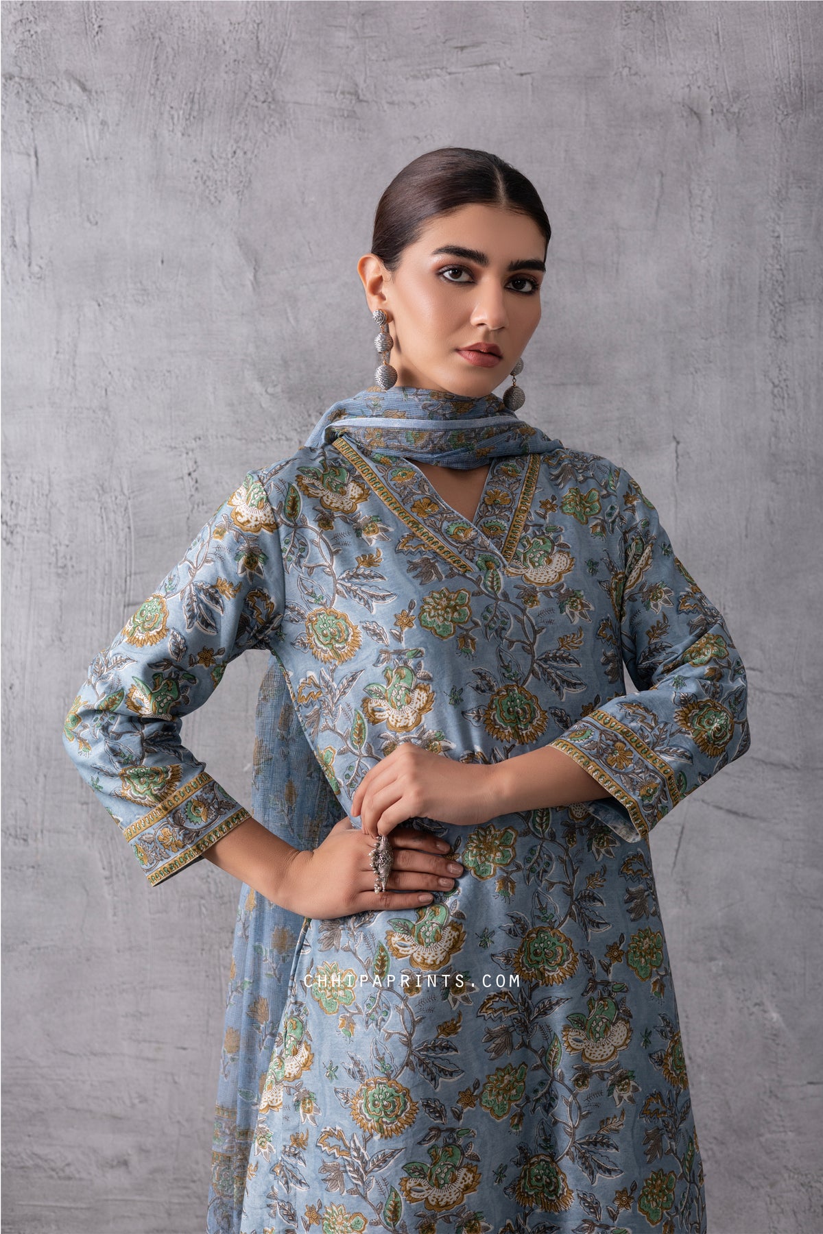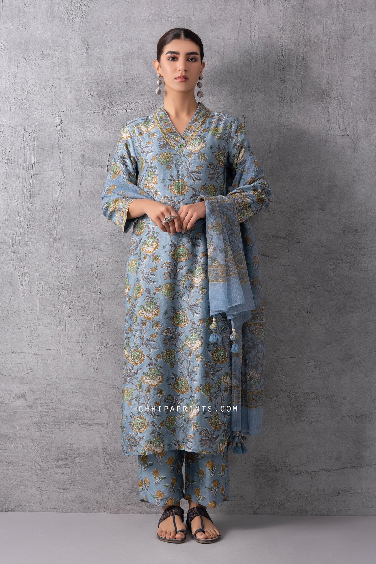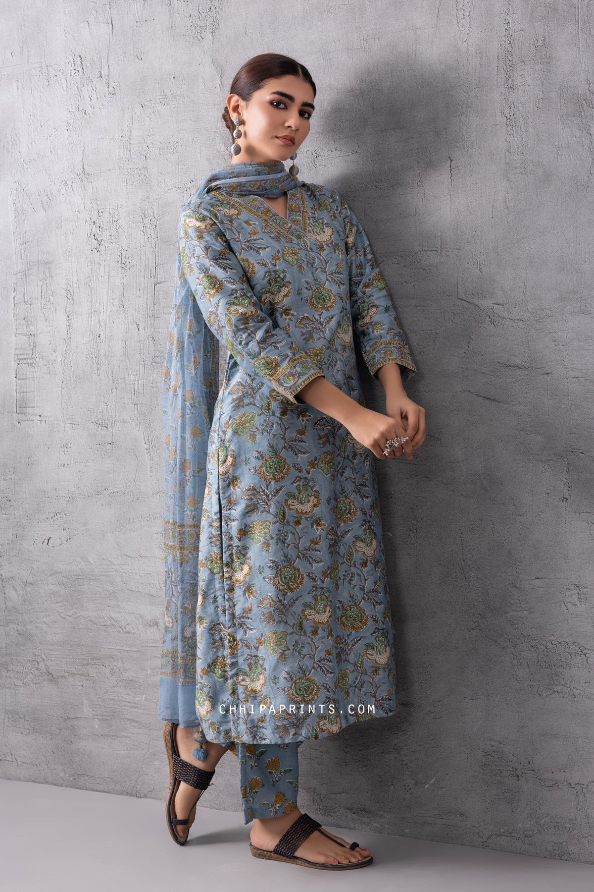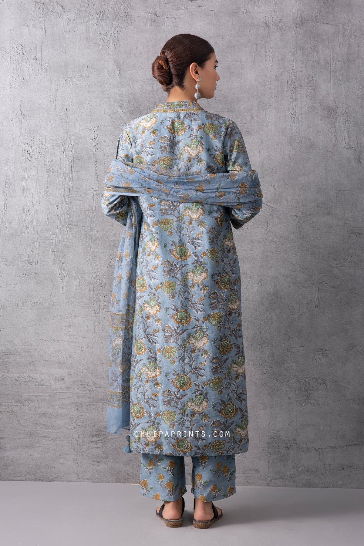 Chanderi SIlk BLock Print Mughal Jaal Kurta Set in Citadel Grey