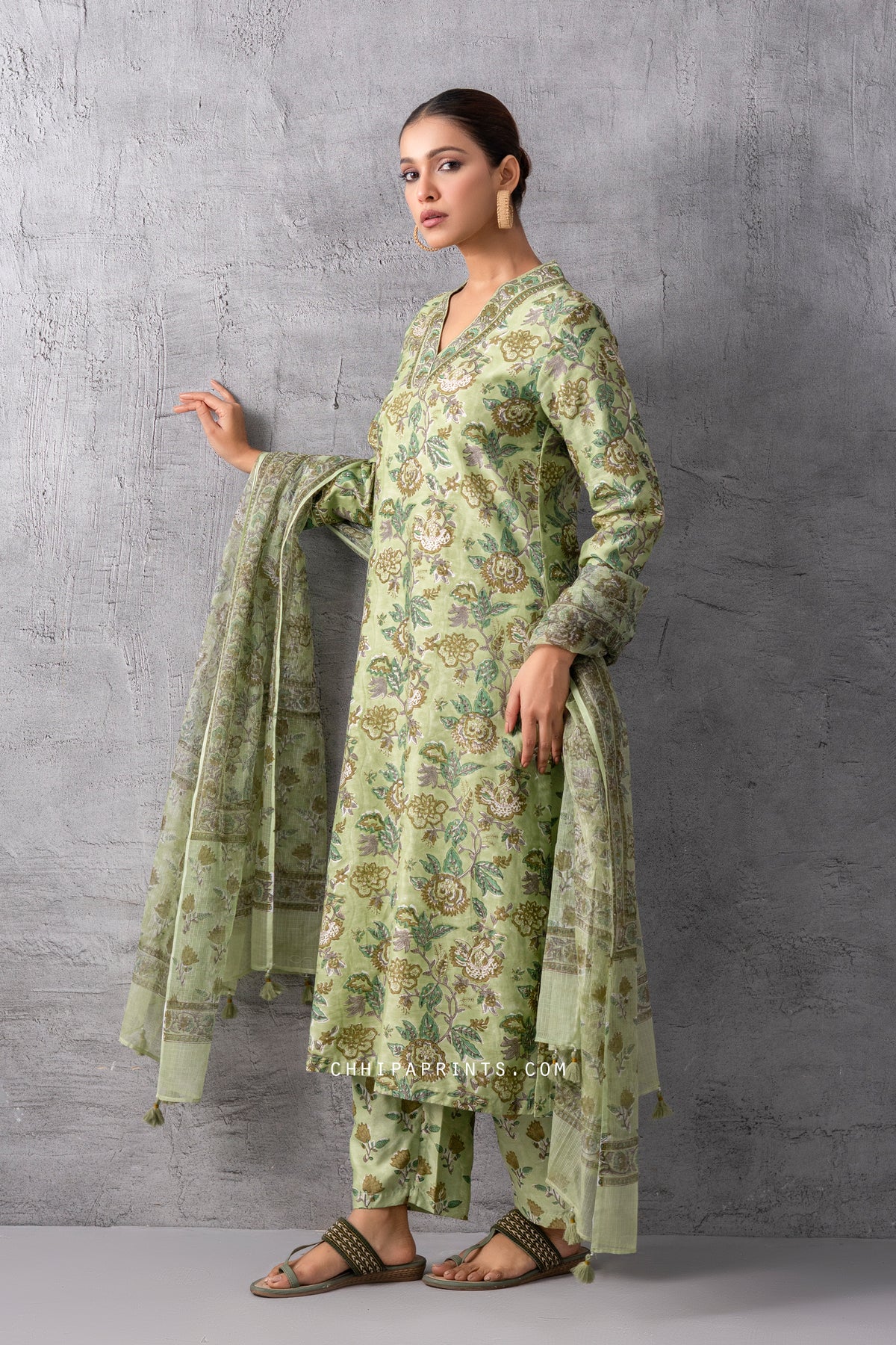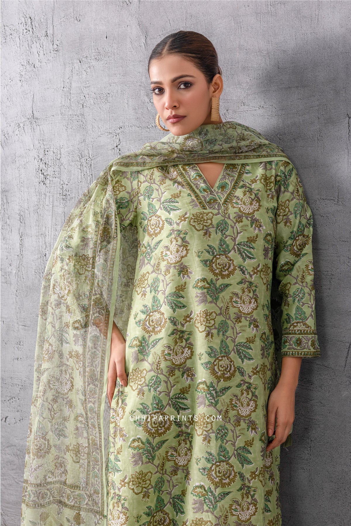 Chanderi SIlk BLock Print Mughal Jaal Kurta Set in Forrest Green