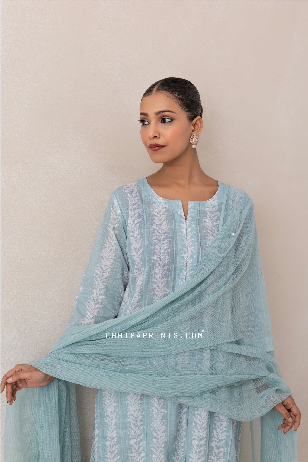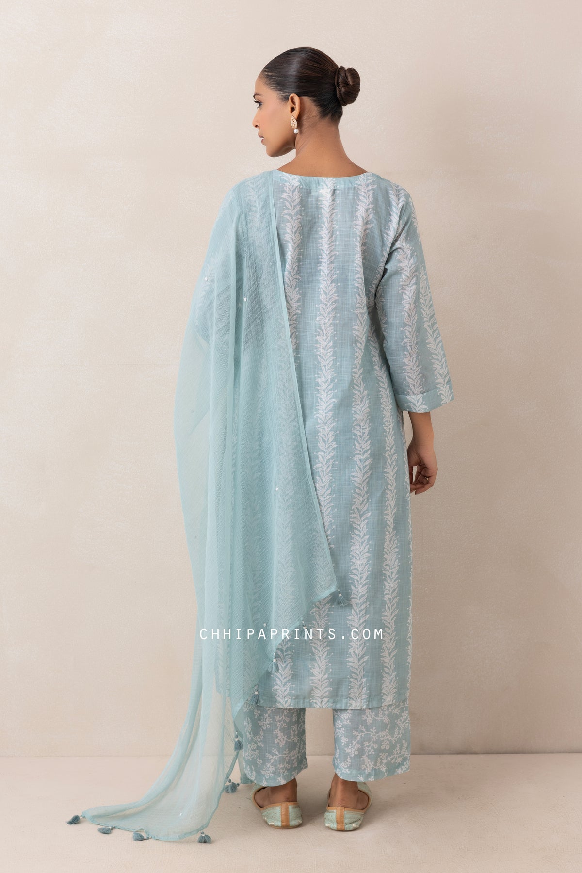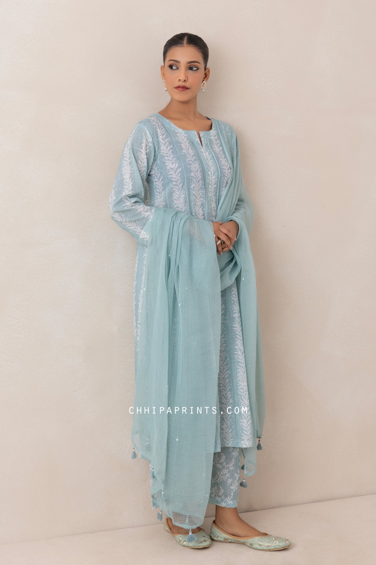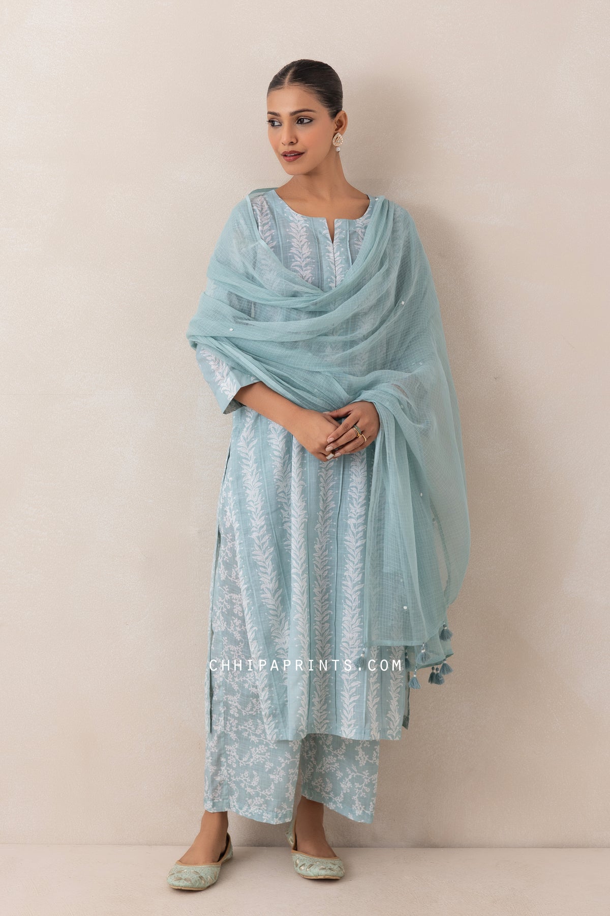 Cotton Bel Border Print with Tucks Kurta Set in Aqua Grey