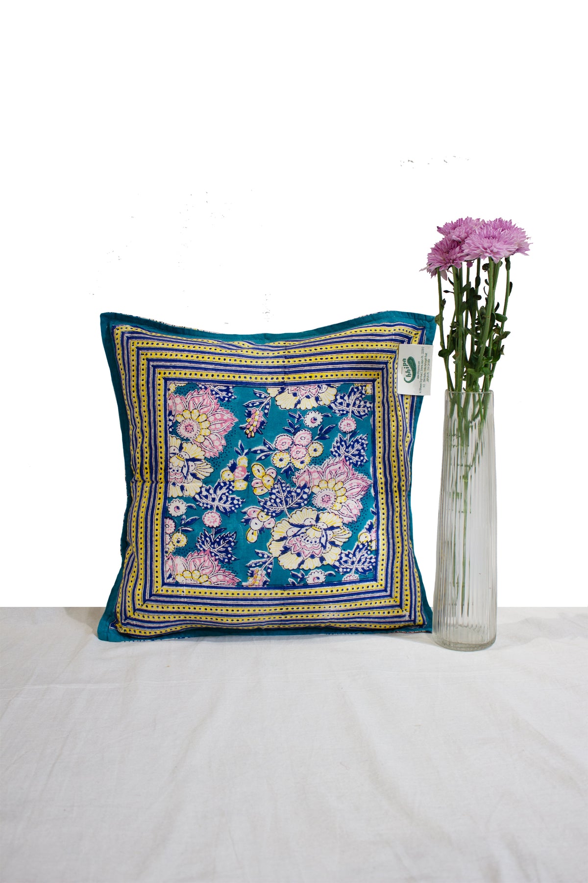 Cotton Flower Buta Block Printed Cushion Cover in Sea Green