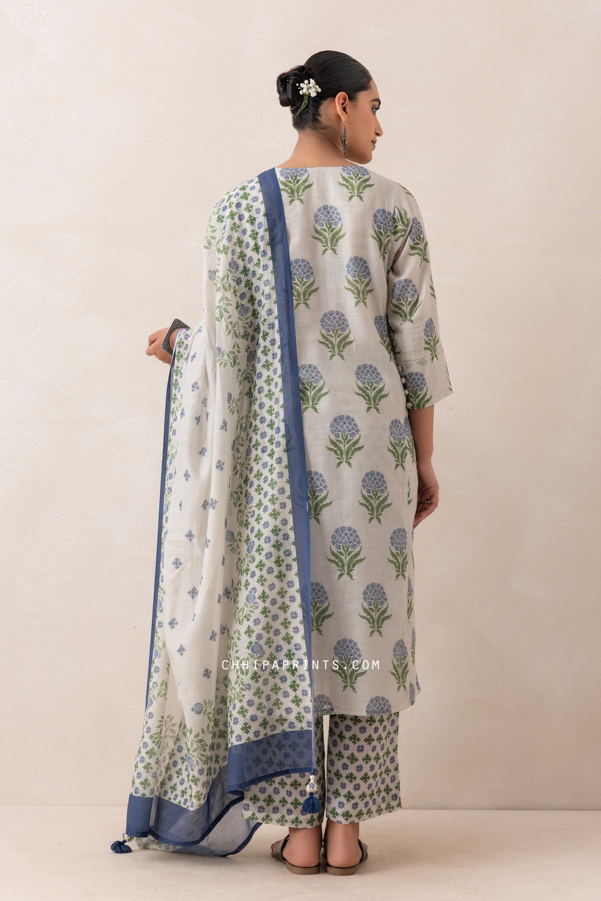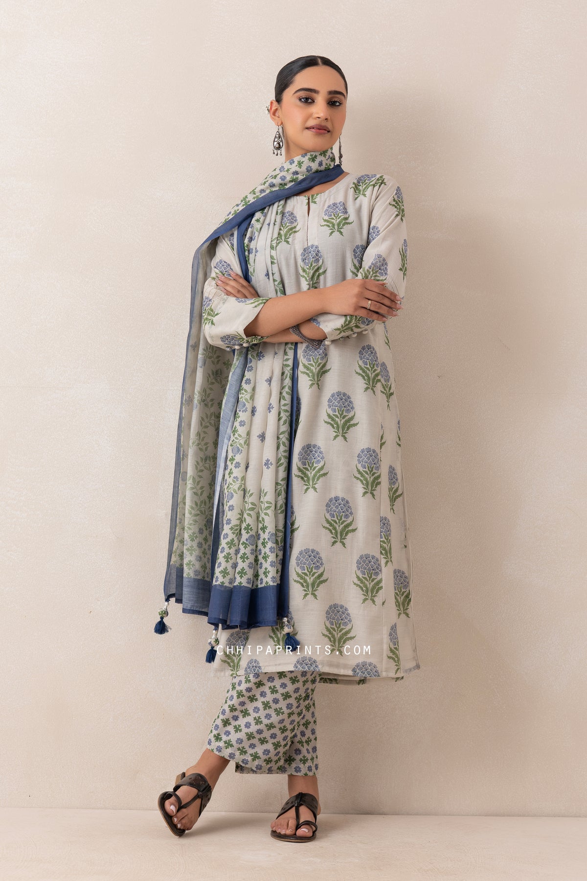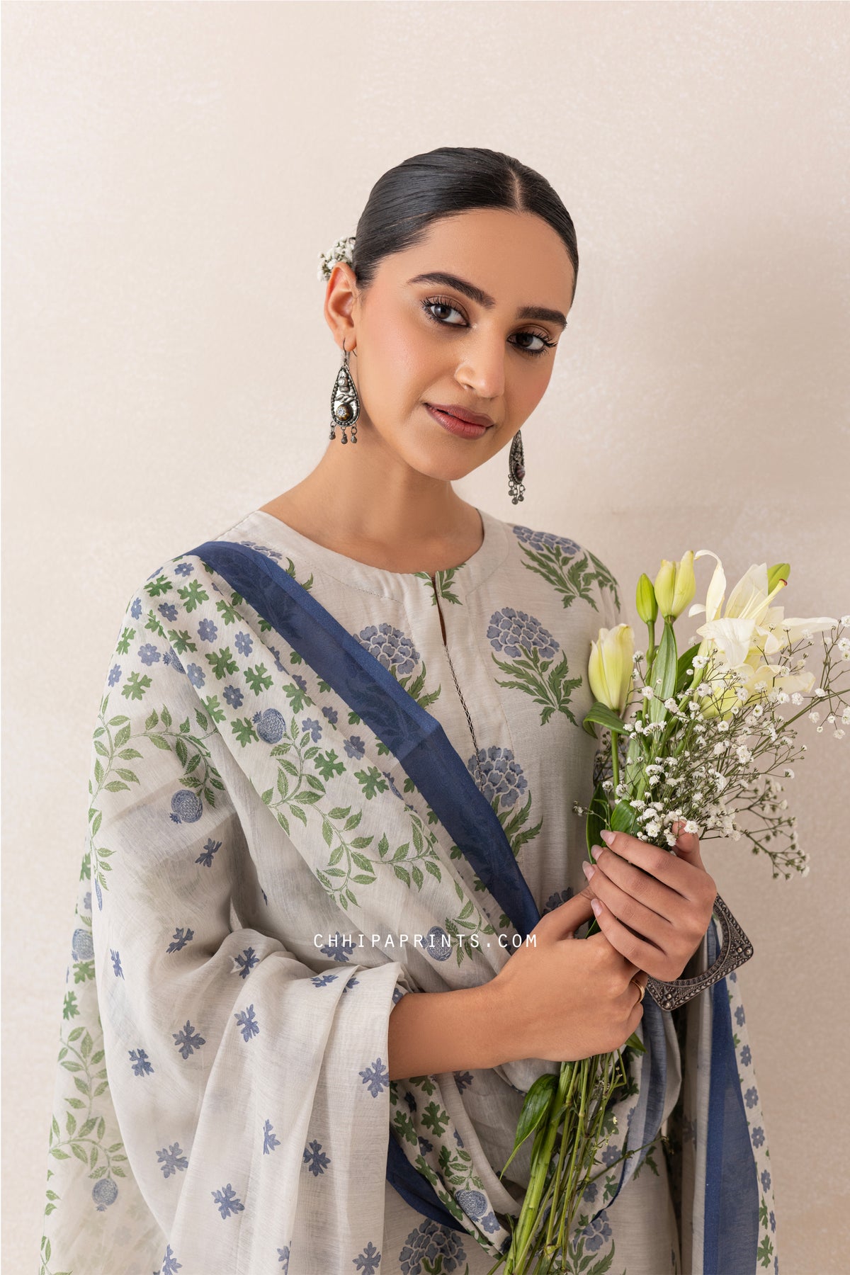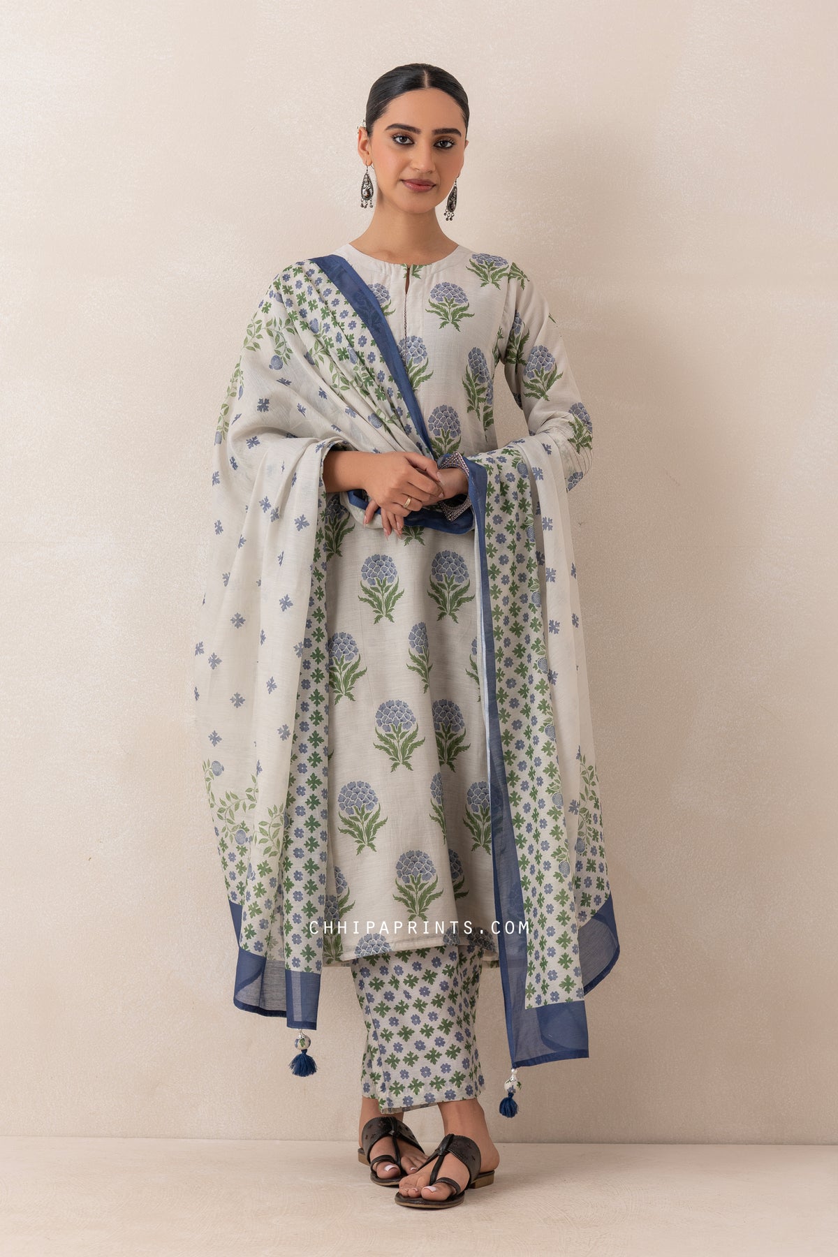 Mulmul Chanderi Silk Chattha Buta Print Kurta Set in Grey & Blue