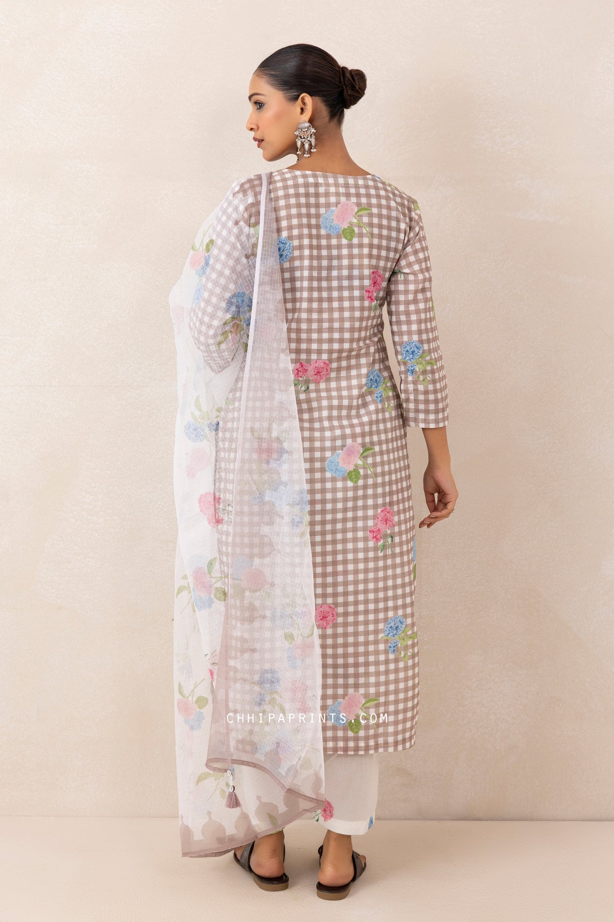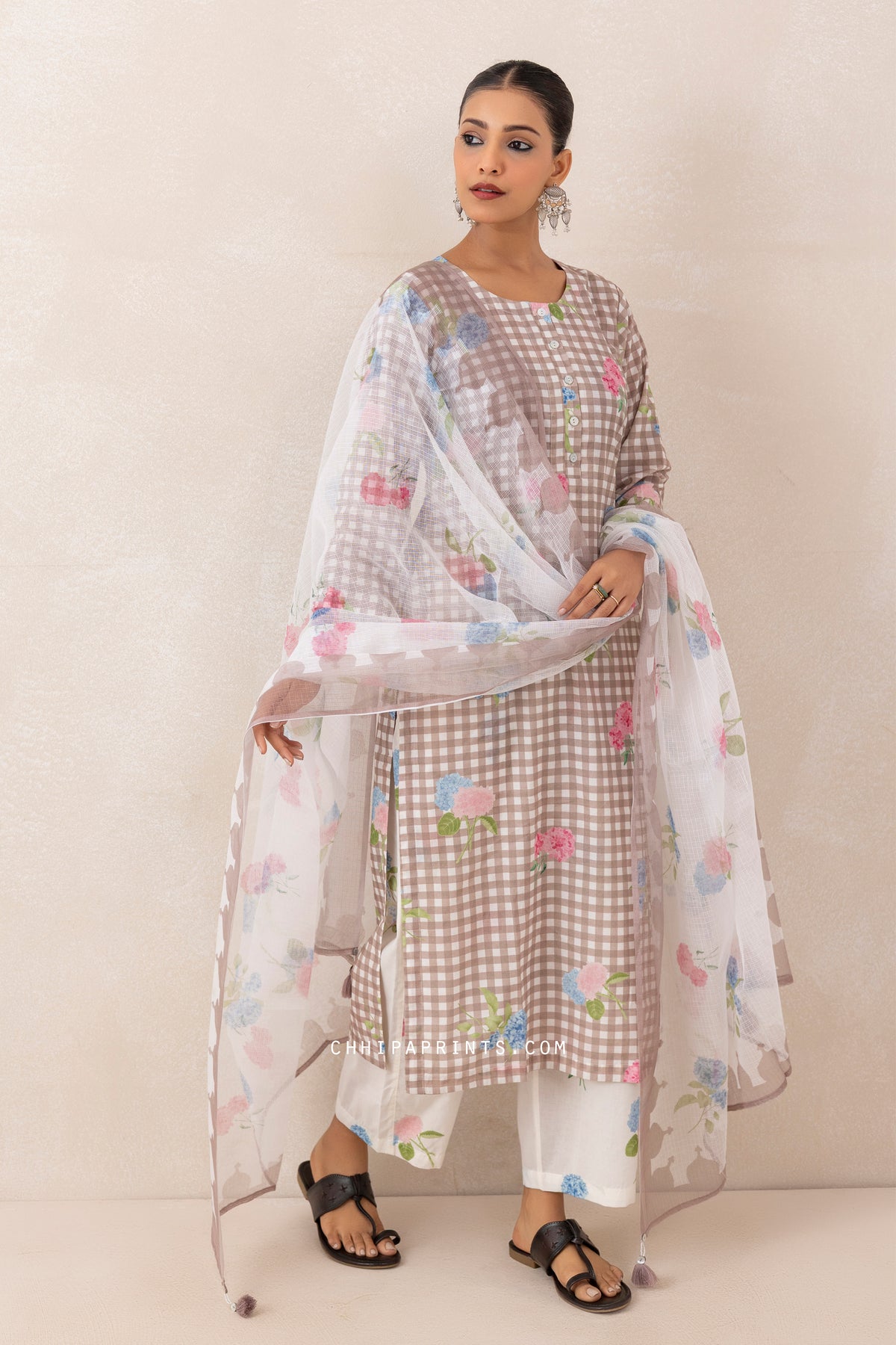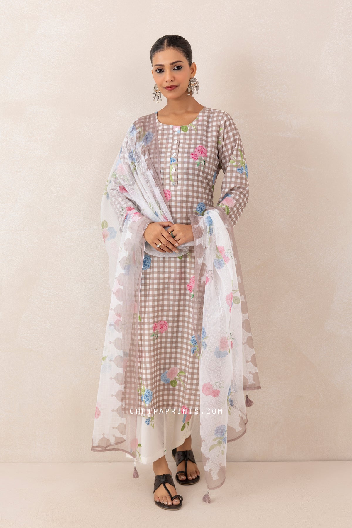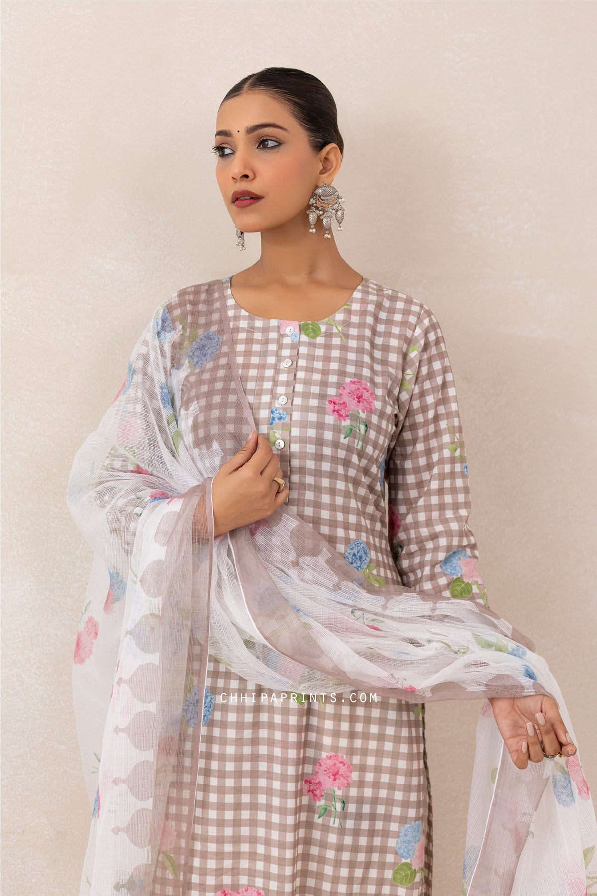 Cotton Gingham Checks Printed Kurta Set in Mushroom Grey