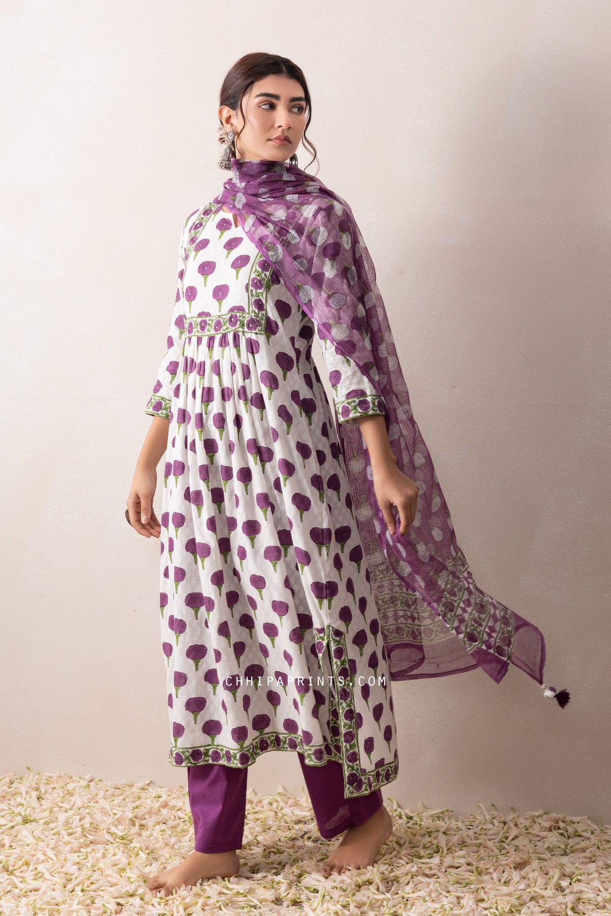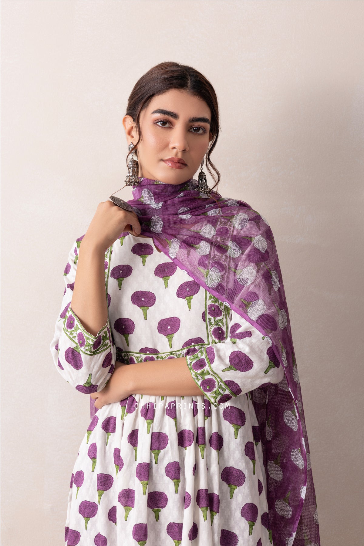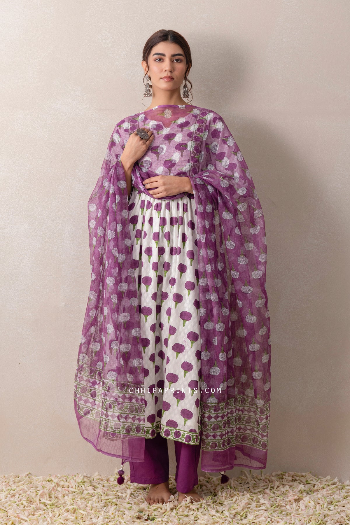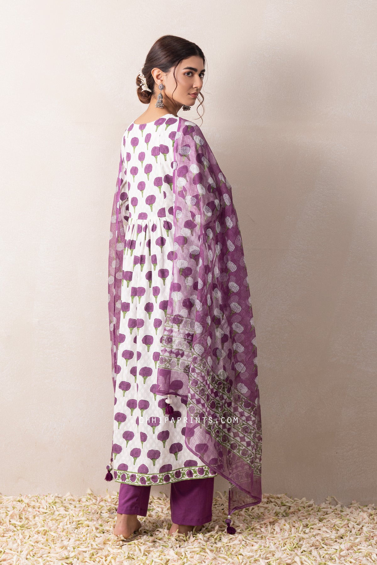 Cotton Dobby Block Print Marigold Buti Kurta Set in Purple