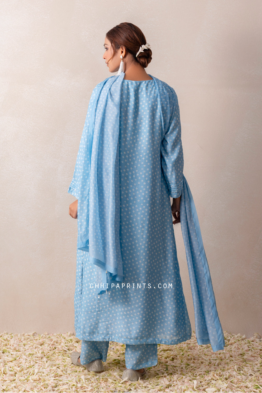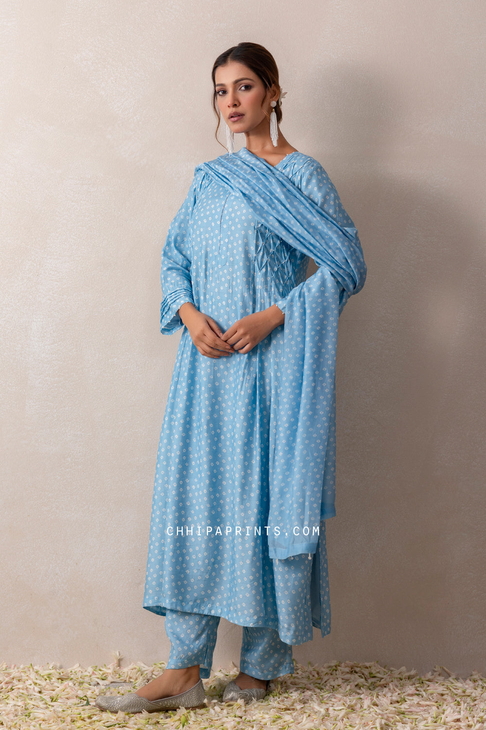 Cotton Silk Bandhani with Smocking Kurta Set in Pastel Blue