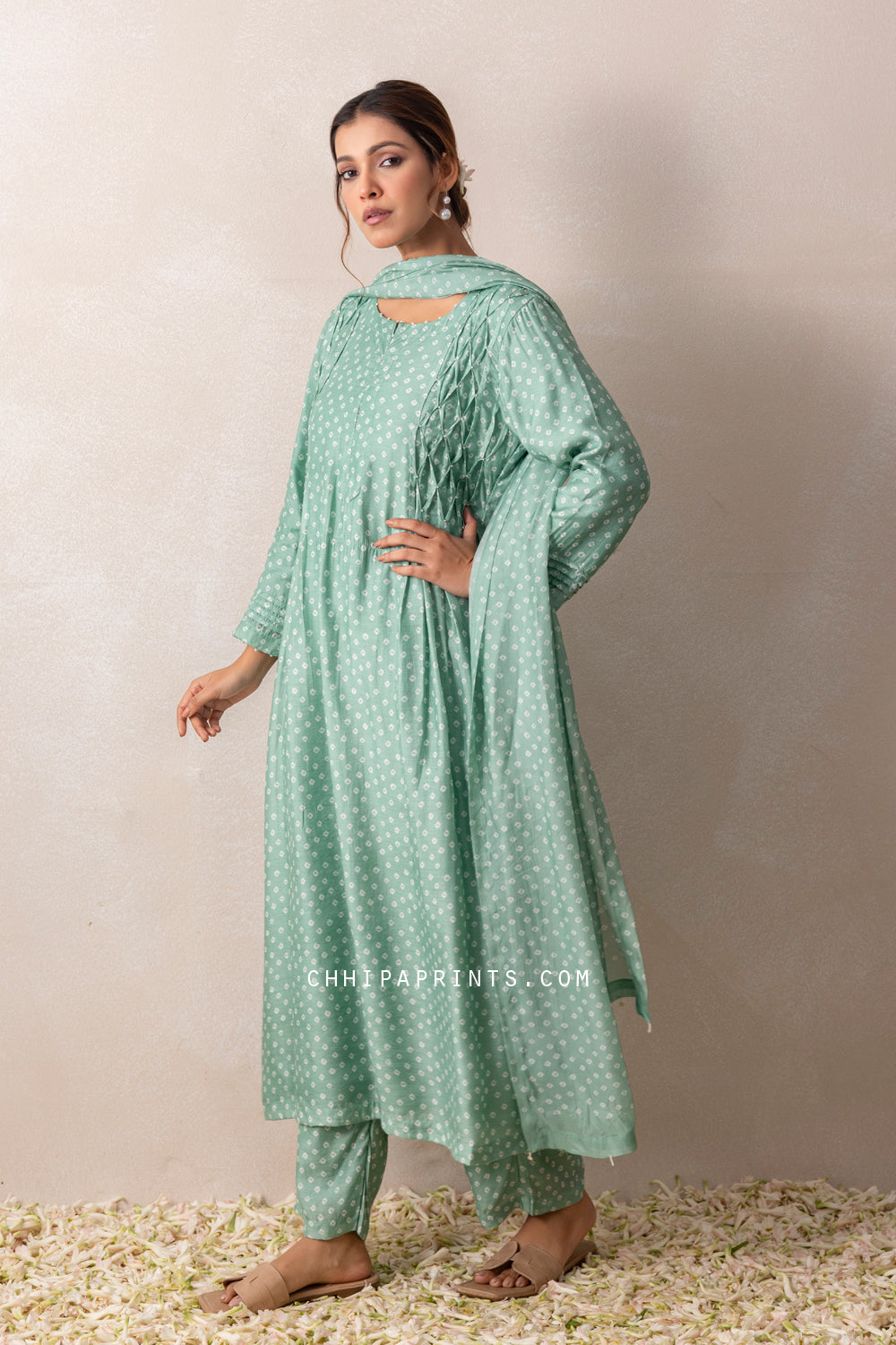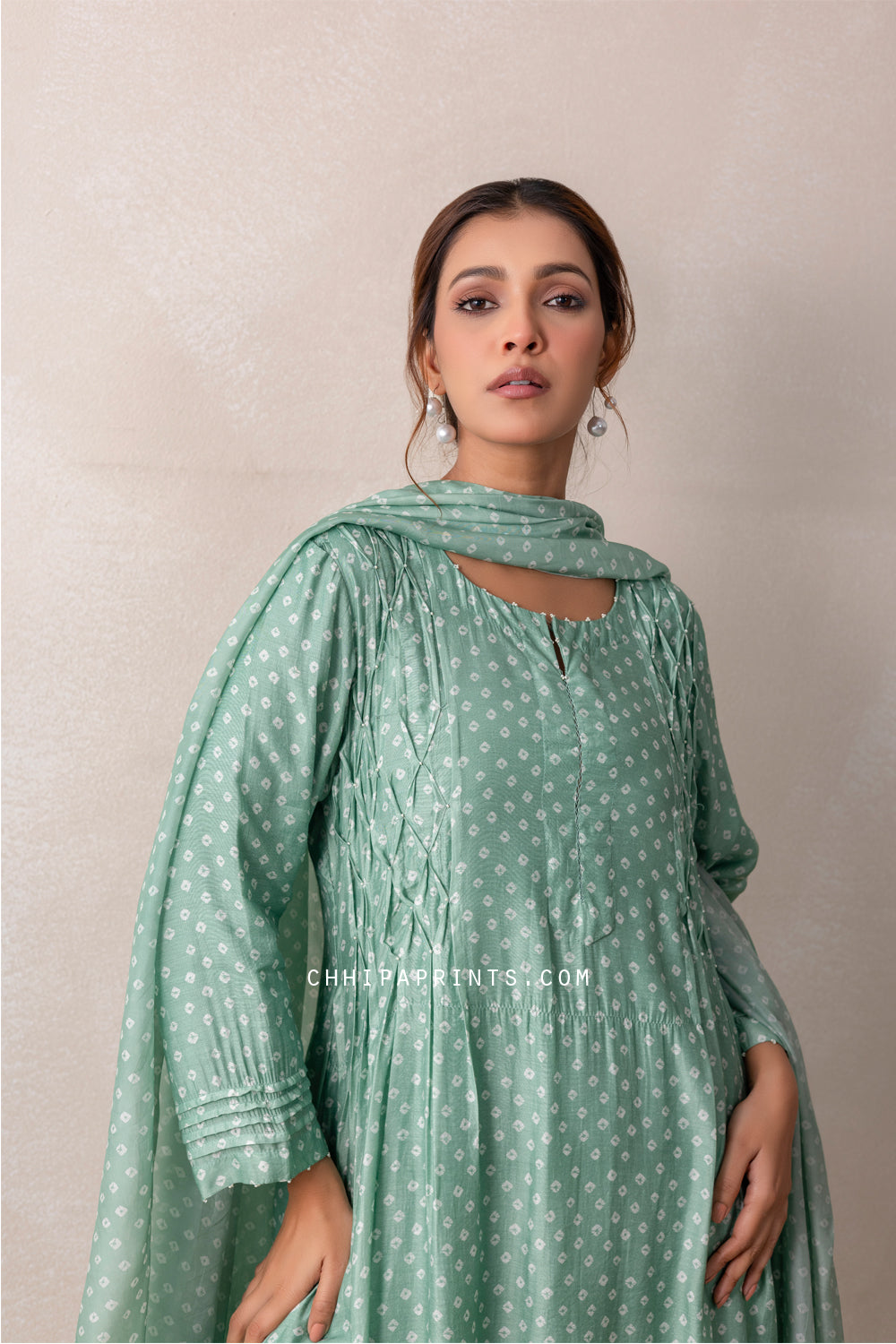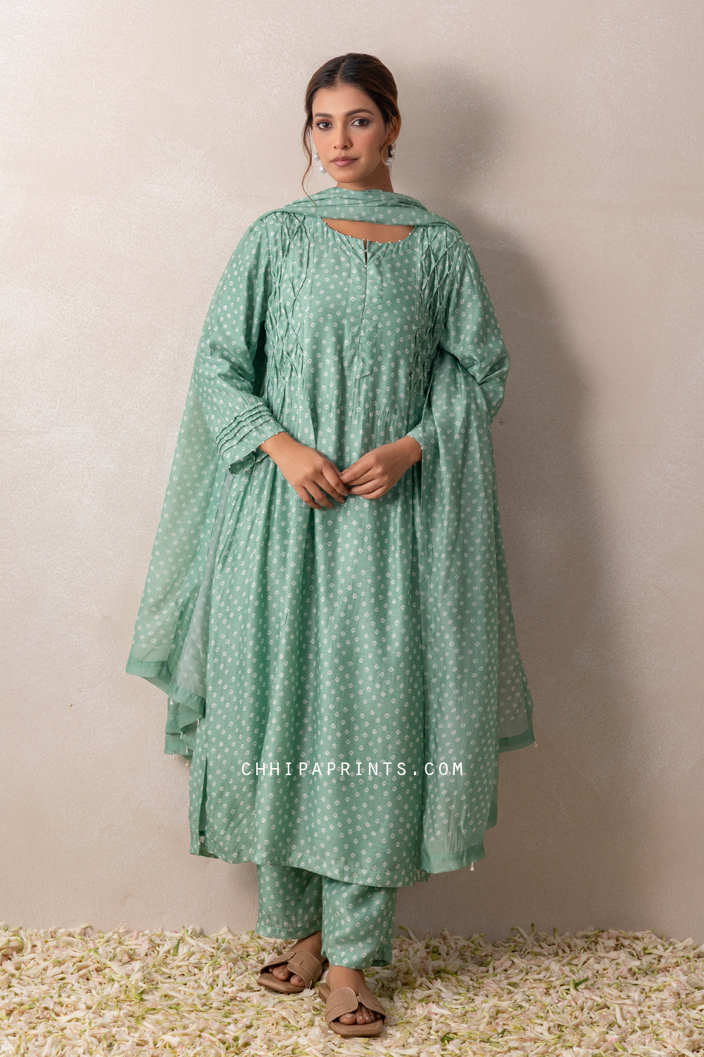 Cotton Silk Bandhani with Smocking Kurta Set in Pastel Green