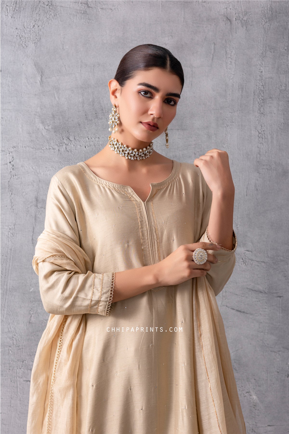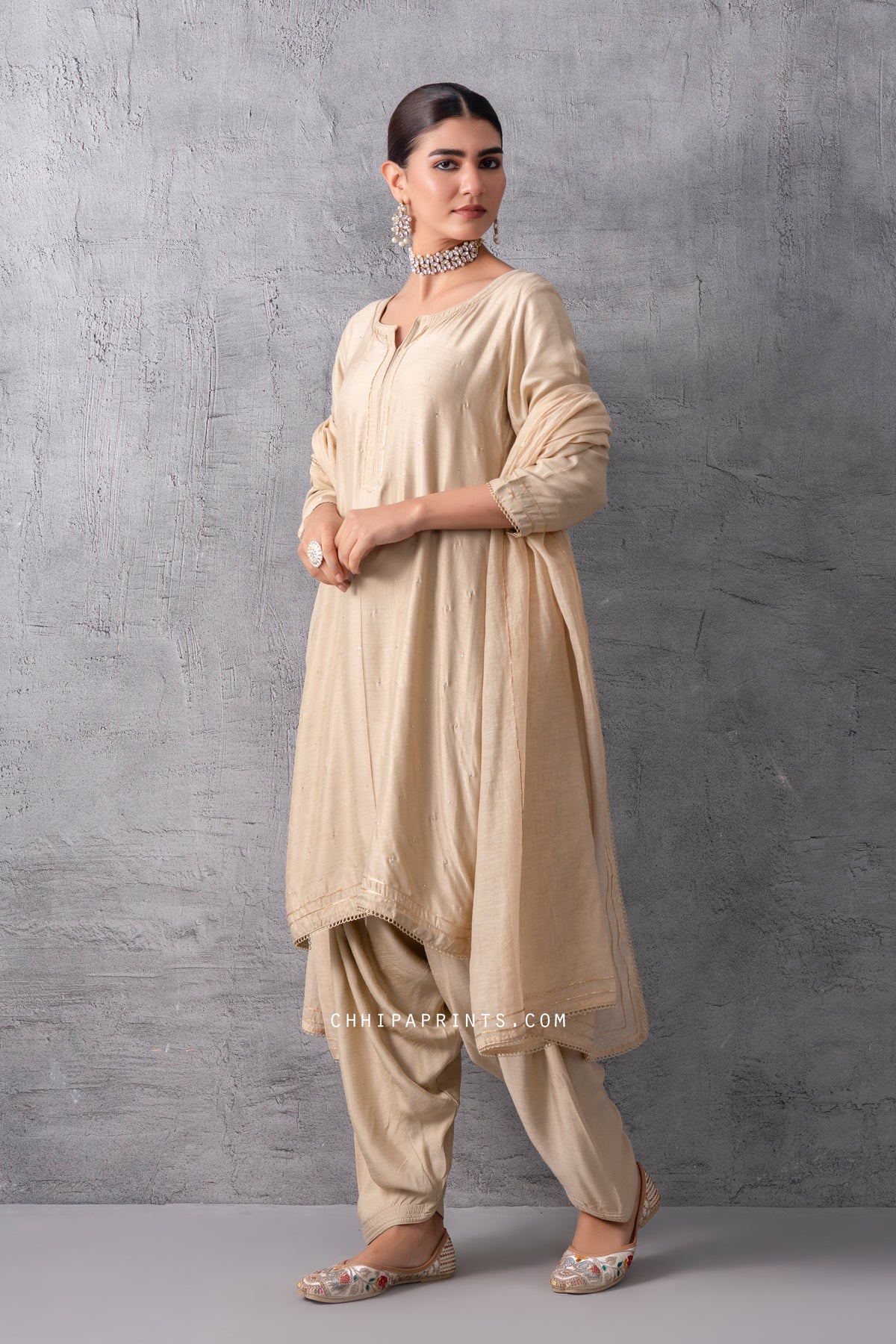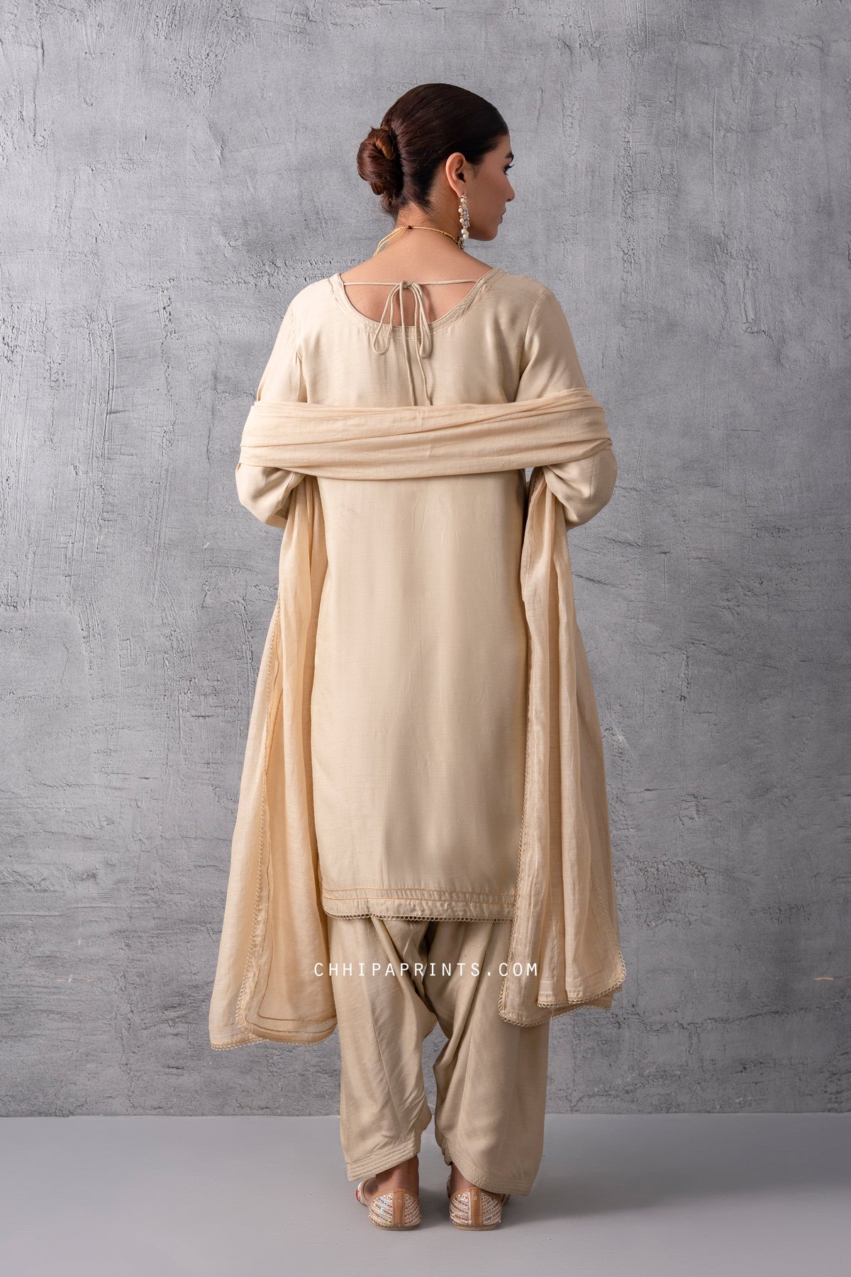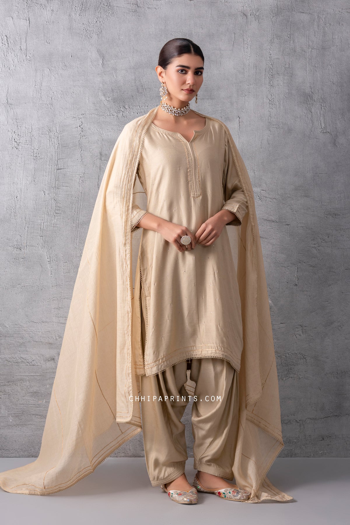 Satin Raw Silk Plain Dye Short Kurta & Patiyala Salwar Set in Sheer Bliss (Set of 3)