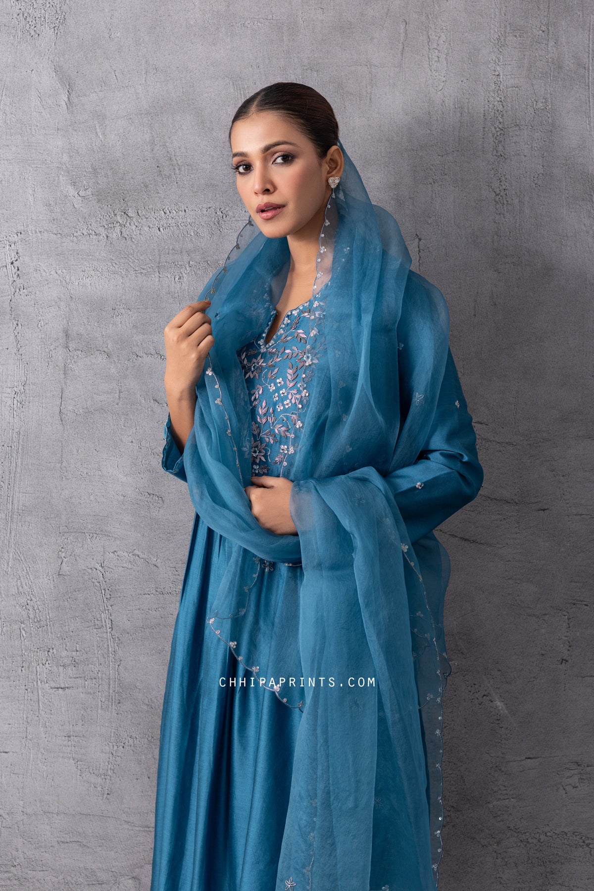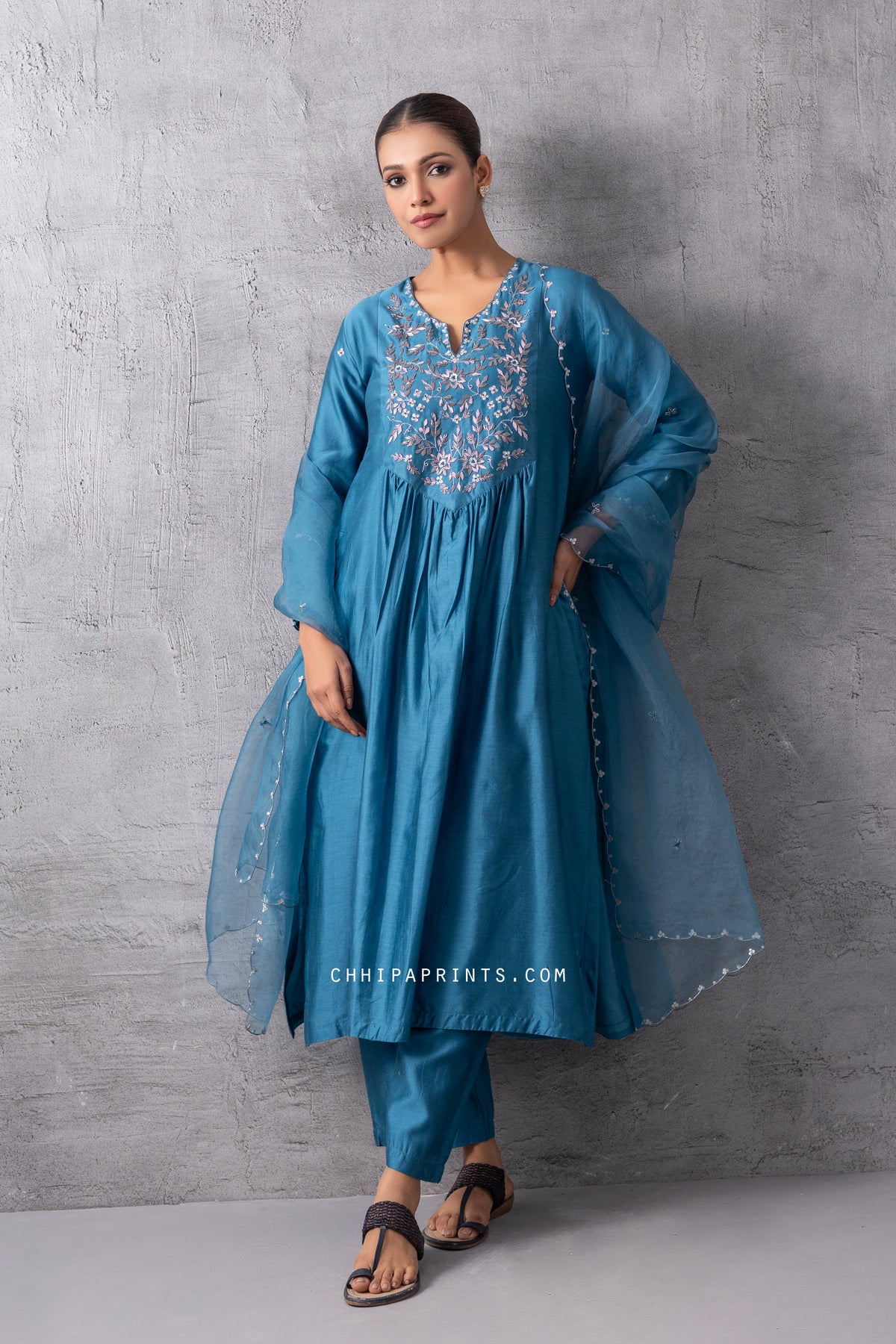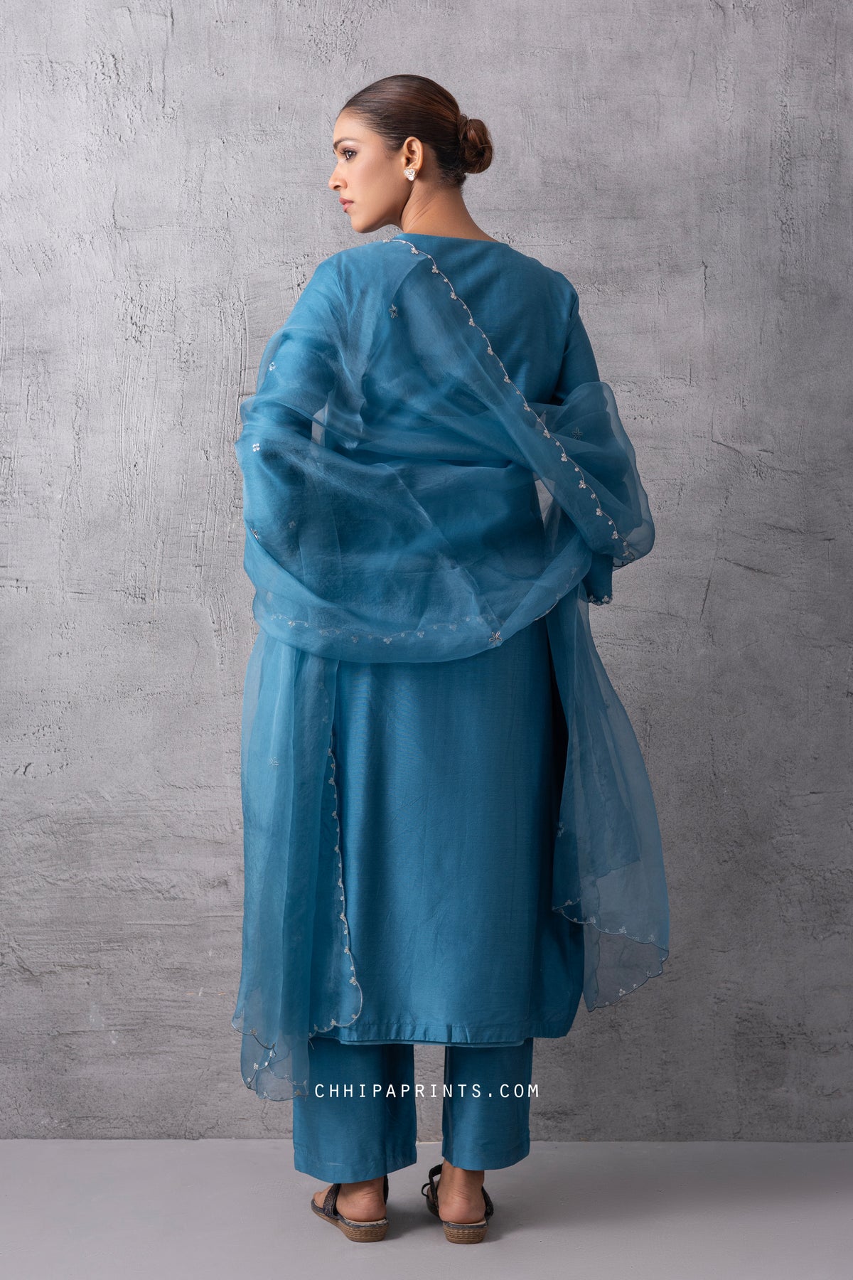 Chanderi Silk Dabka Embroidery Yoke Kurta Set in Imperial Blue