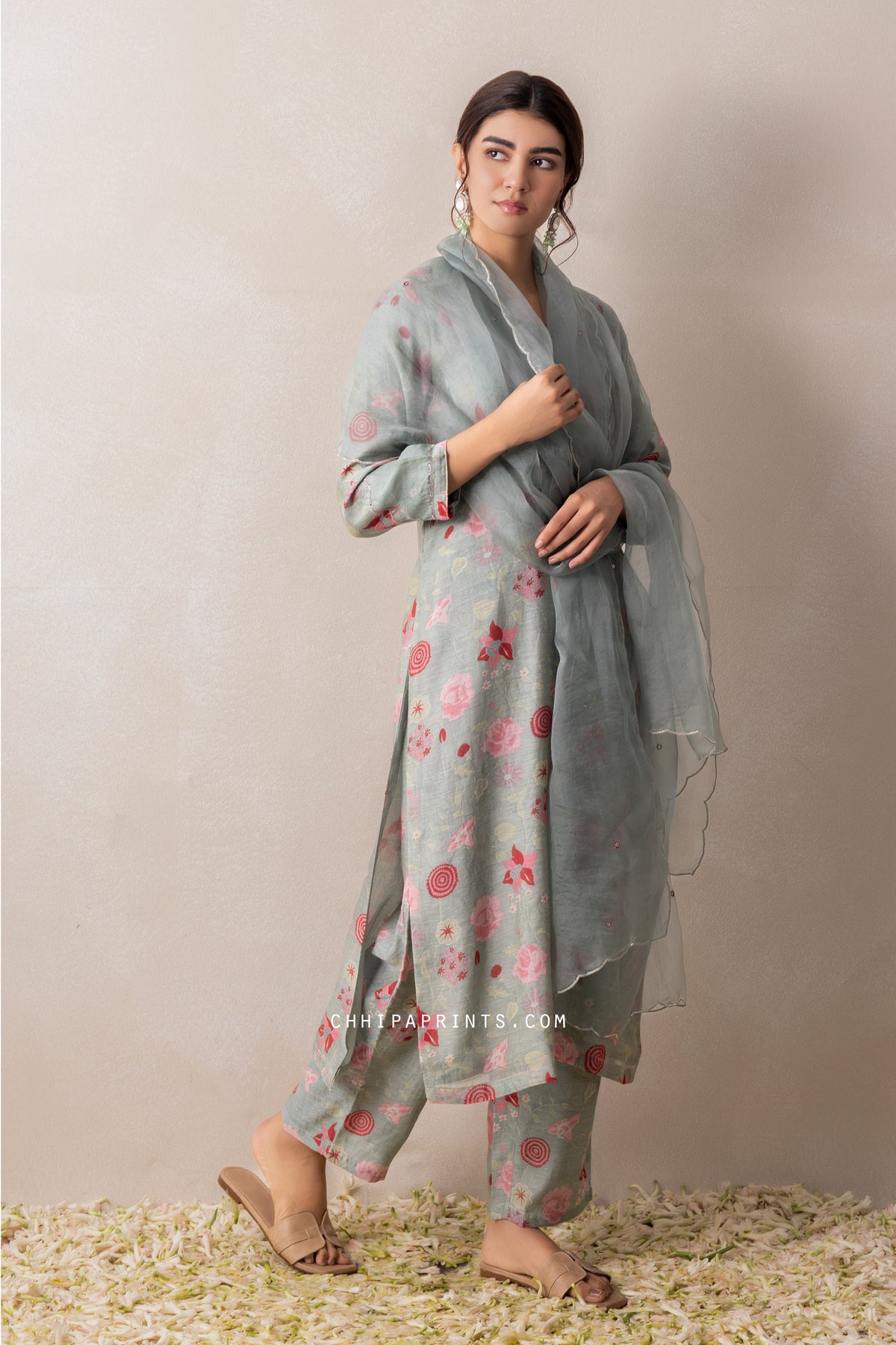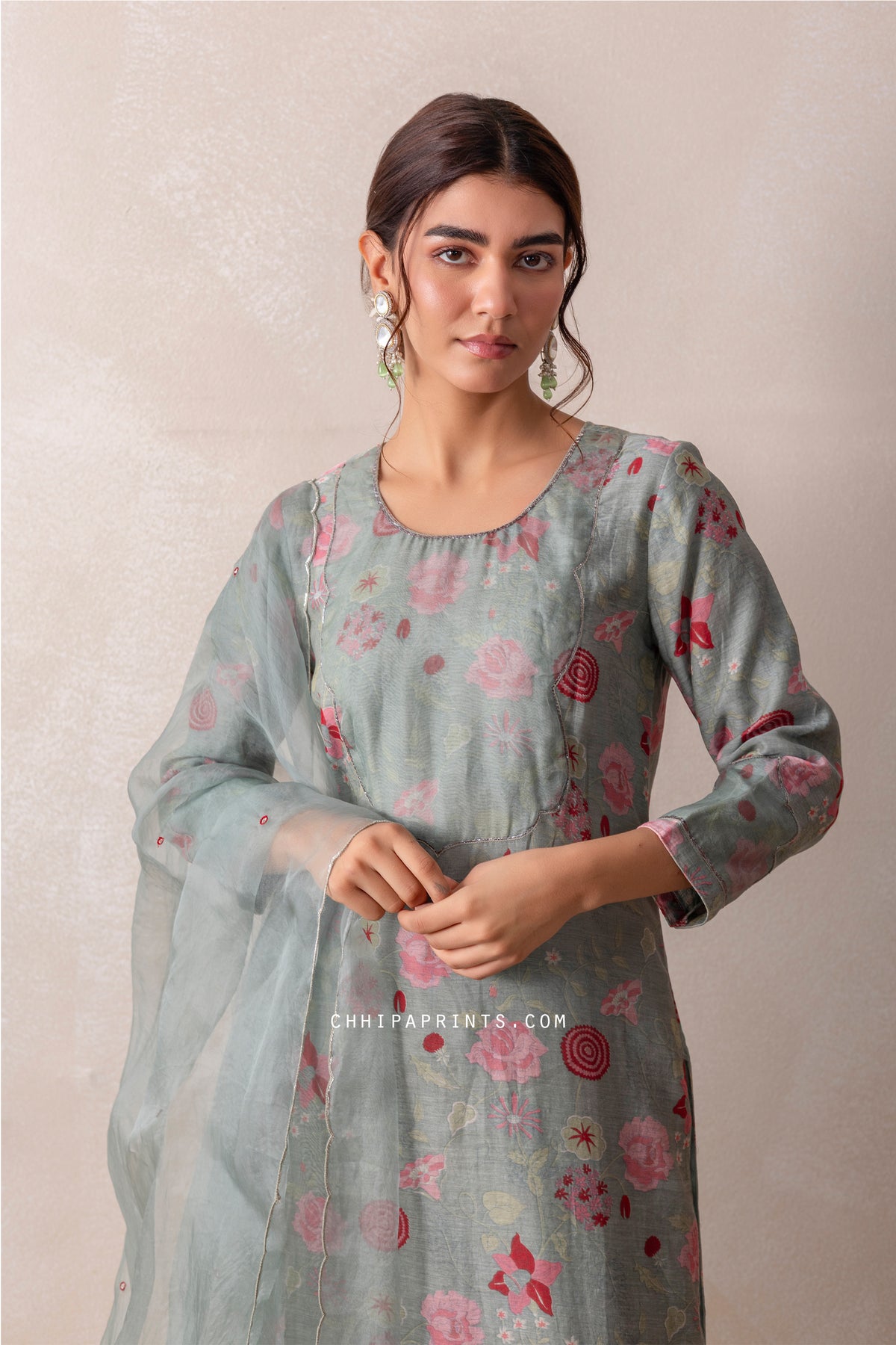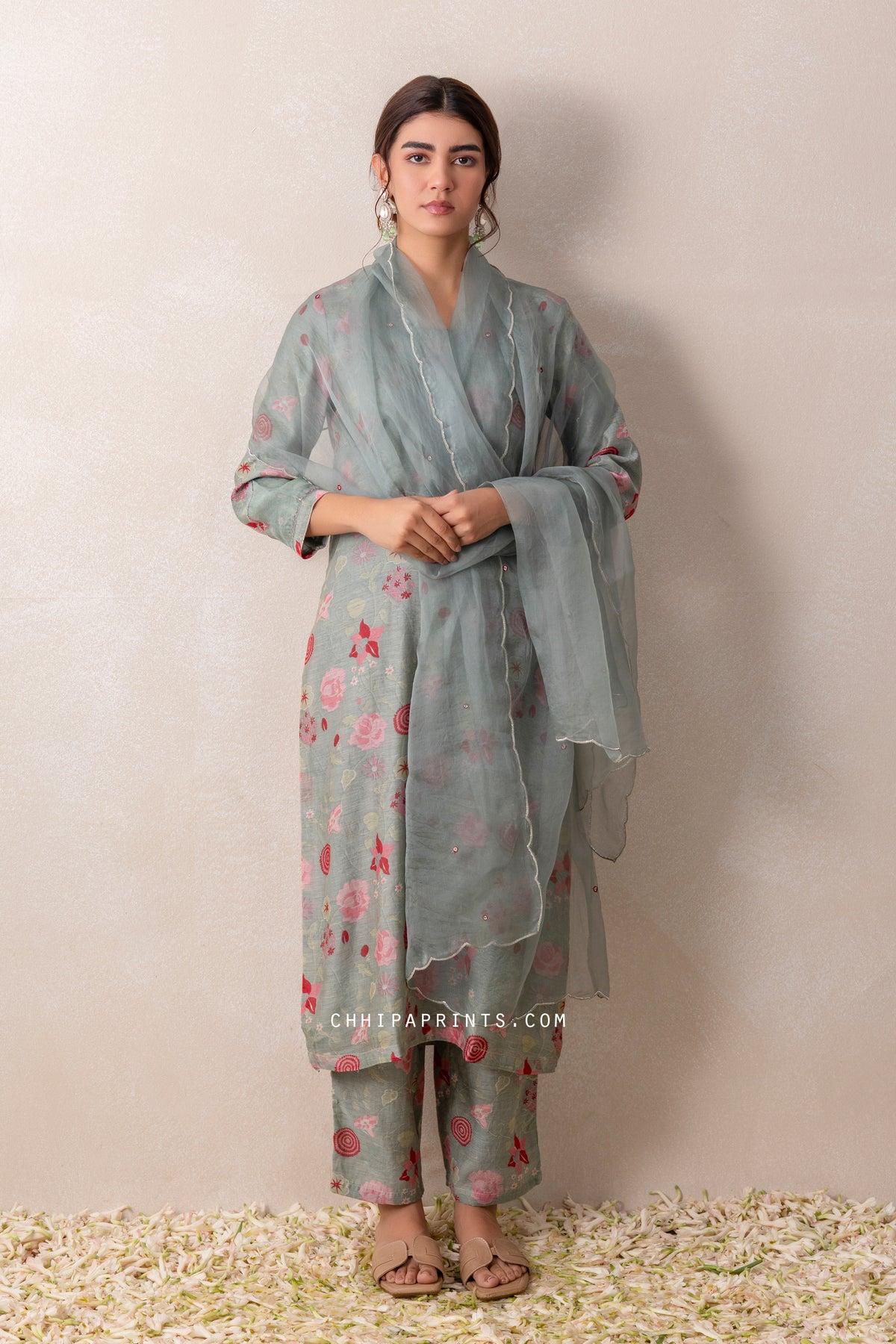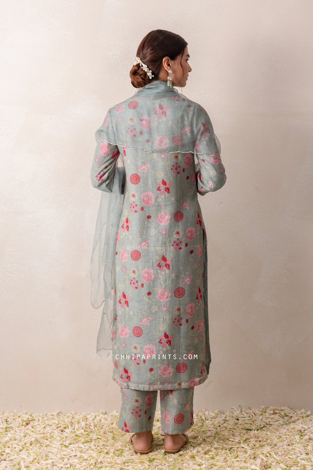 Chanderi SIlk Hand Printed Mehrab Applique Yoke Kurta Set in Aqua Grey