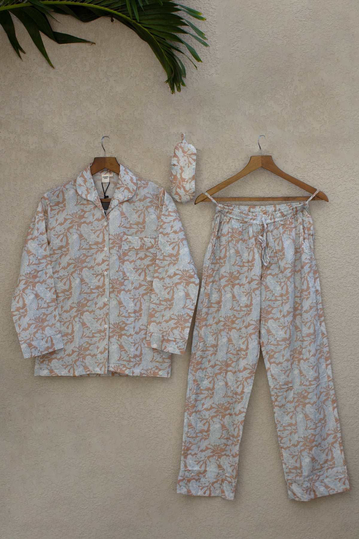 Cotton Bird Print Night Suit with Eye Mask in Peach