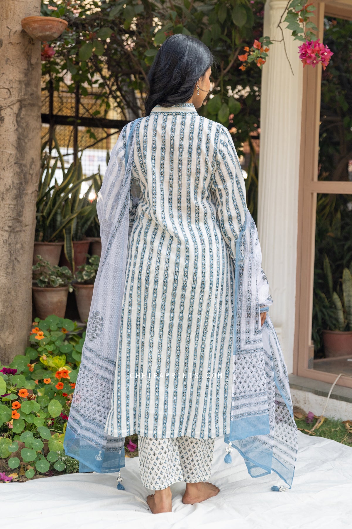 Cotton Block Print Parcha Border Kurta Set in Shades of Blue